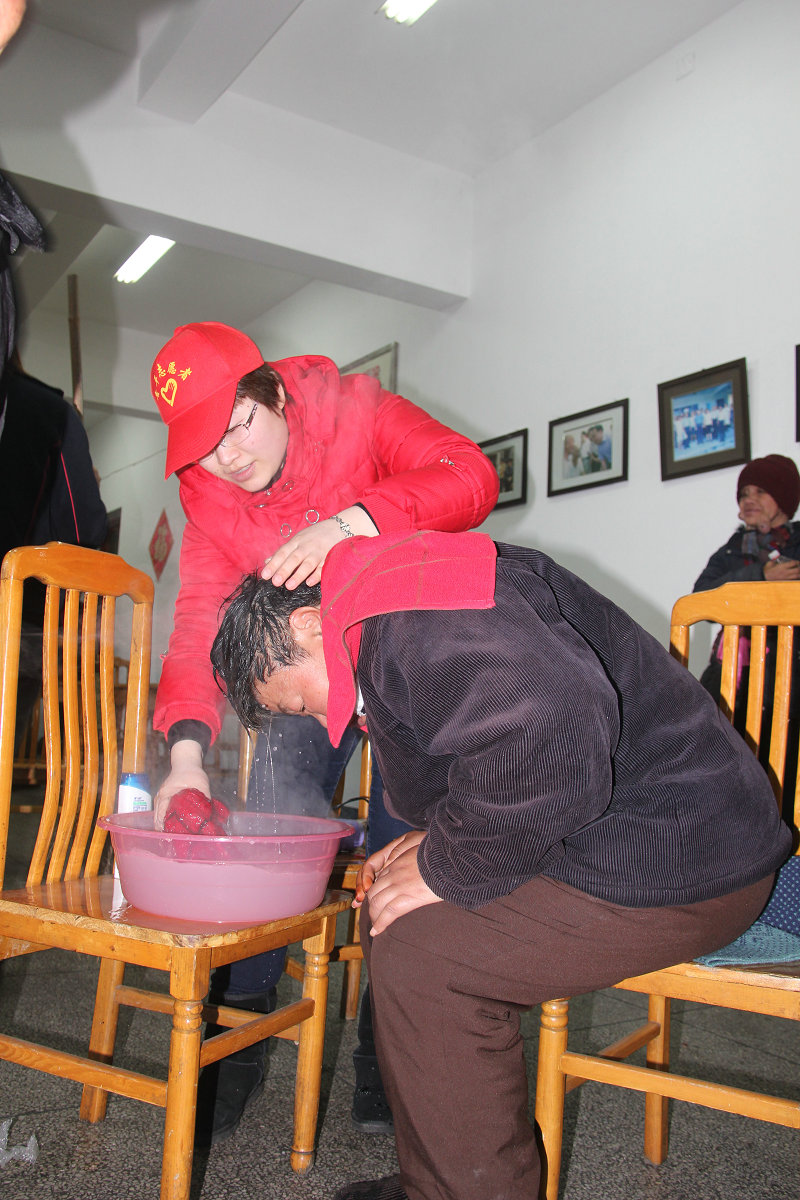 圖為集團(tuán)志愿者正在為柯橋夕陽(yáng)紅中心老人洗頭
