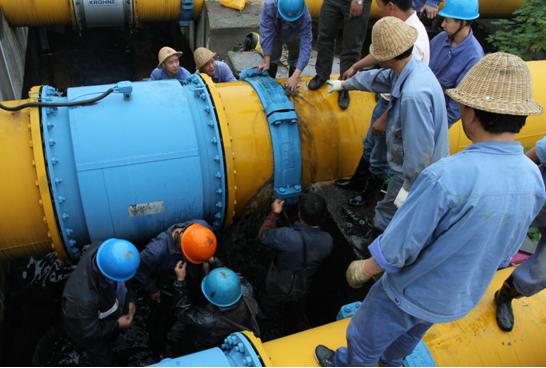 當(dāng)時(shí),工作人員正在現(xiàn)場(chǎng)巡視,實(shí)然發(fā)現(xiàn)市排DN800管道流量計(jì)后硬性伸縮節(jié)滲漏噴水,于是立即按照?qǐng)?bào)告制度進(jìn)行匯報(bào),該公司立即啟動(dòng)應(yīng)急預(yù)案。搶修分兩路展開(kāi),一隊(duì)人員用應(yīng)急水泵,將滲漏的污水打入生產(chǎn)系統(tǒng)中;另一隊(duì)人員對(duì)滲漏點(diǎn)進(jìn)行檢查,確定是因硬性伸縮節(jié)的兩顆螺絲膨脹后崩斷造成爆管。在通知排水公司對(duì)進(jìn)廠流量進(jìn)行控制的同時(shí),現(xiàn)場(chǎng)搶修指揮人員立即組織維修人員對(duì)硬性伸縮節(jié)進(jìn)行更換。維修人員在采取相關(guān)安全措施后,冒著不斷噴出的污水,立刻進(jìn)行拆裝螺栓作業(yè)。隨著水流一點(diǎn)點(diǎn)變小,漏點(diǎn)最終被徹底控制。