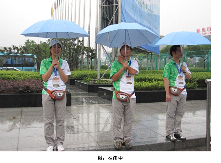 “傘,很多觀眾都沒帶,外面雨好大呀!”林隊長焦急地喊道:“同志們,考驗我們的時刻到了!”這時隊員們二話沒說,很快統一著雨披,手拿著傘,奔向雨中,給如常的觀眾撐傘。隊員們不厭其煩的在大雨中往返于檢票大門和場館安檢口之間,不知跑了多少個來回,直到把一個個觀眾安全地送進場館……我們痛并快樂著!