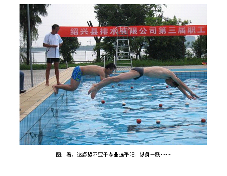 上午舉行第三屆職工游泳比賽,公司在柯橋南岸公園舉行第三屆職工游泳比賽。本次比賽項目分為男子個人50米、女子個人25米,此項水上運動公司已連續(xù)舉辦三年,深受職工歡迎,有近40名職工參加。比賽緊張有序,現(xiàn)場氣氛活躍,精彩場面不斷,加油聲不絕于耳。